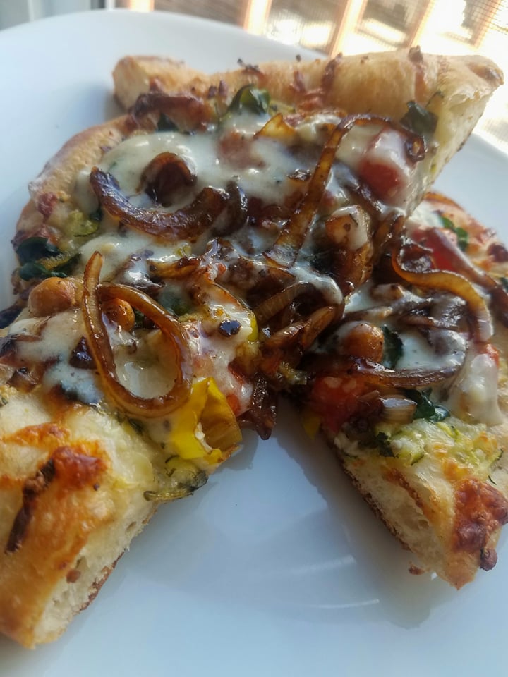 I step into the kitchen and pull out a few ingredients that I know will go together and that I’m in the mood to eat. Then I look around and it’s like the puzzle starts pulling itself together as I see what I have to work with. Zucchini. Shredded zucchini? Yes. *Starts shredding* Shredded zucchini mixed with shredded cheese. Intriguing. What do you think you’re going to do with it? We’ve got pizza dough. I’m not feeling a red sauce with this. *open fridge* Vidalia onion dressing, perfect. Dough. Dressing. Garlic herb seasoning. Shredded zucchini, mozzarella, and parmesan seasoned and sprinkled on top. Loaded with… *searches produce drawer* …fresh spinach, sliced pepperoncini, diced tomatoes, garlic roasted chickpeas, caramelized onions. *Into the oven* It seems like it’s missing something though, what am I missing? *looks around* Oh I think some fig balsamic glazed onions and a parmesan canna-cream sauce would be perfect!